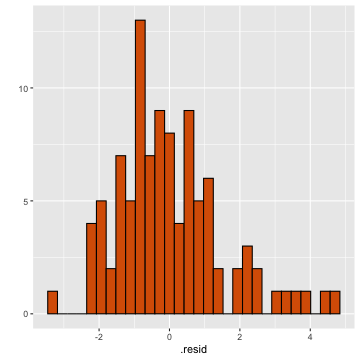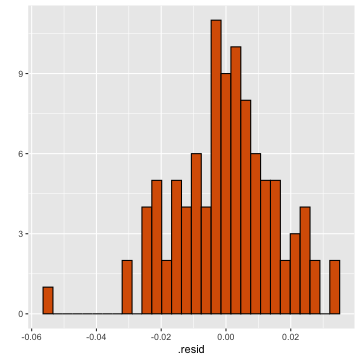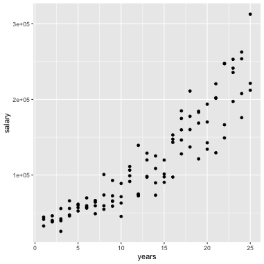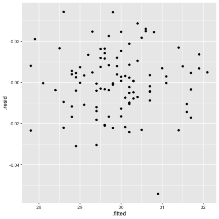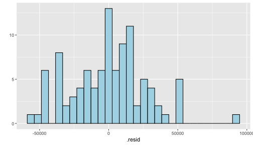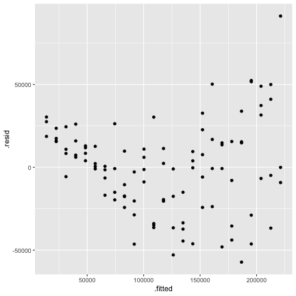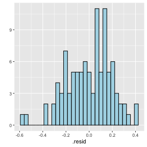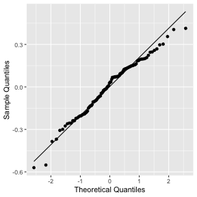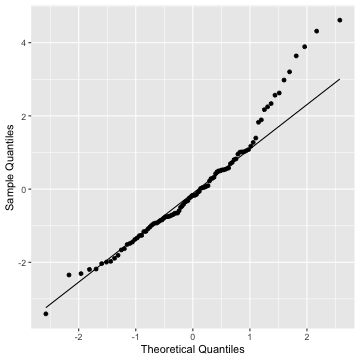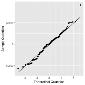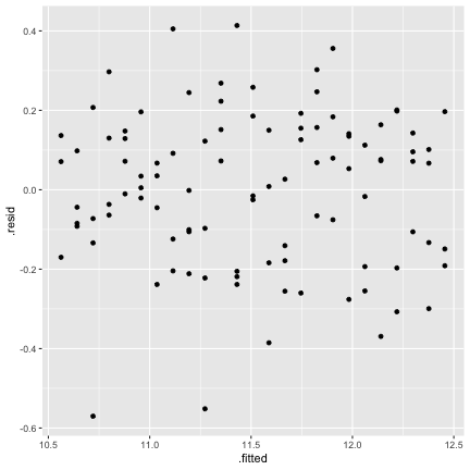 class: center, middle, inverse, title-slide # STA 506 2.0 Linear Regression Analysis ## Lecture 11-i: Transformations to Correct Model Inadequacies ### Dr Thiyanga S. Talagala ### 2020-11-07 --- ## Introduction In this section we are going to learn methods and procedures for building regression models when the assumptions are violated. ### Transformations - Variance-stabilizing transformations - Transformations to linearize the model ### How to get around the problem? - Transform `\(X\)` variable(s) - Transform `\(Y\)` - Transformations on both `\(X\)` variable(s) and `\(Y\)`. --- class: duke-orange, middle ## Variance-Stabilizing Transformations --- ## Dataset 1 We will try to model salary as a function of years of experience. ```r library(tidyverse) salarydata <- read_csv("salarydata.csv") salarydata ``` ``` # A tibble: 100 x 2 years salary <dbl> <dbl> 1 1 41504 2 1 32619 3 1 44322 4 2 40038 5 2 46147 6 2 38447 7 2 38163 8 3 42104 9 3 25597 10 3 39599 # … with 90 more rows ``` Data are obtained from: https://daviddalpiaz.github.io/appliedstats/transformations.html --- ## Salary vs Years of Experience ```r ggplot(salarydata, aes(x=years, y=salary)) + geom_point() ``` <!-- --> ```r cor(salarydata$years, salarydata$salary) ``` ``` [1] 0.9133066 ``` --- ## Fit a Simple Linear Regression Model ```r salary_fit <- lm(salary ~ years, data = salarydata) summary(salary_fit) ``` ``` Call: lm(formula = salary ~ years, data = salarydata) Residuals: Min 1Q Median 3Q Max -57225 -18104 241 15589 91332 Coefficients: Estimate Std. Error t value Pr(>|t|) (Intercept) 5302 5750 0.922 0.359 years 8637 389 22.200 <2e-16 *** --- Signif. codes: 0 '***' 0.001 '**' 0.01 '*' 0.05 '.' 0.1 ' ' 1 Residual standard error: 27360 on 98 degrees of freedom Multiple R-squared: 0.8341, Adjusted R-squared: 0.8324 F-statistic: 492.8 on 1 and 98 DF, p-value: < 2.2e-16 ``` --- ## Compute Residuals and Fitted Values ```r library(broom) salary_residuals <- augment(salary_fit) salary_residuals ``` ``` # A tibble: 100 x 8 salary years .fitted .resid .std.resid .hat .sigma .cooksd <dbl> <dbl> <dbl> <dbl> <dbl> <dbl> <dbl> <dbl> 1 41504 1 13939. 27565. 1.03 0.0391 27347. 0.0215 2 32619 1 13939. 18680. 0.697 0.0391 27428. 0.00988 3 44322 1 13939. 30383. 1.13 0.0391 27315. 0.0261 4 40038 2 22575. 17463. 0.650 0.0345 27436. 0.00753 5 46147 2 22575. 23572. 0.877 0.0345 27388. 0.0137 6 38447 2 22575. 15872. 0.590 0.0345 27447. 0.00622 7 38163 2 22575. 15588. 0.580 0.0345 27449. 0.00600 8 42104 3 31212. 10892. 0.404 0.0302 27473. 0.00255 9 25597 3 31212. -5615. -0.208 0.0302 27490. 0.000677 10 39599 3 31212. 8387. 0.311 0.0302 27482. 0.00151 # … with 90 more rows ``` --- ## Residuals vs Fitted Values ```r ggplot(salary_residuals, aes(x=.fitted, y=.resid)) + geom_point() ``` <!-- --> --- ## Normality assumption .pull-left[ ```r qplot(data=salary_residuals, x=.resid,)+ geom_histogram(color="black", fill="lightblue") ``` <!-- --> ```r shapiro.test(salary_residuals$.resid) ``` ``` Shapiro-Wilk normality test data: salary_residuals$.resid W = 0.98258, p-value = 0.2101 ``` ] .pull-right[ ```r ggplot(salary_residuals, aes(sample=.resid))+ stat_qq() + stat_qq_line() + labs(x="Theoretical Quantiles", y="Sample Quantiles") ``` <!-- --> ] --- ## Variance - Stabilizing Transformations .pull-left[ <!-- --> ] .pull-left[ - Useful variance-stabilizing transformations - square root: `\(\sqrt{y}\)` - log transformation: `\(log(y)\)` - reciprocal: `\(y^{-1}\)` - reciprocal square root: `\(y^{-1/2}\)` ] --- ## Apply log transformation `$$log(Y) = \beta_0 + \beta_1x_ + \epsilon$$` ```r salarydata$log.salary <- log(salarydata$salary) salarydata ``` ``` # A tibble: 100 x 3 years salary log.salary <dbl> <dbl> <dbl> 1 1 41504 10.6 2 1 32619 10.4 3 1 44322 10.7 4 2 40038 10.6 5 2 46147 10.7 6 2 38447 10.6 7 2 38163 10.5 8 3 42104 10.6 9 3 25597 10.2 10 3 39599 10.6 # … with 90 more rows ``` --- ## Fit a regression model with log transformation ```r salary_fit_log <- lm(log.salary ~ years, data = salarydata) salary_fit_log ``` ``` Call: lm(formula = log.salary ~ years, data = salarydata) Coefficients: (Intercept) years 10.48381 0.07888 ``` --- ## Compute Residuals and Fitted values ```r salary_log_residuals <- augment(salary_fit_log) salary_log_residuals ``` ``` # A tibble: 100 x 8 log.salary years .fitted .resid .std.resid .hat .sigma .cooksd <dbl> <dbl> <dbl> <dbl> <dbl> <dbl> <dbl> <dbl> 1 10.6 1 10.6 0.0709 0.370 0.0391 0.196 0.00278 2 10.4 1 10.6 -0.170 -0.887 0.0391 0.196 0.0160 3 10.7 1 10.6 0.137 0.713 0.0391 0.196 0.0103 4 10.6 2 10.6 -0.0440 -0.229 0.0345 0.196 0.000936 5 10.7 2 10.6 0.0980 0.510 0.0345 0.196 0.00465 6 10.6 2 10.6 -0.0845 -0.440 0.0345 0.196 0.00346 7 10.5 2 10.6 -0.0919 -0.479 0.0345 0.196 0.00409 8 10.6 3 10.7 -0.0725 -0.377 0.0302 0.196 0.00221 9 10.2 3 10.7 -0.570 -2.96 0.0302 0.187 0.137 10 10.6 3 10.7 -0.134 -0.696 0.0302 0.196 0.00754 # … with 90 more rows ``` --- ## Residuals vs Fitted values <!-- --> --- ## Residuals vs Fitted .pull-left[ `$$Y = \beta_0 + \beta_1x + \epsilon$$` <!-- --> ] .pull-right[ `$$log(Y) = \beta_0 + \beta_1x + \epsilon$$` <!-- --> ] --- ## Normality assumption `\(log(Y) = \beta_0 + \beta_1x + \epsilon\)` ```r qplot(data=salary_log_residuals, x=.resid,)+ geom_histogram(color="black", fill="lightblue") ``` <!-- --> --- ## Normality assumption (cont.) ```r ggplot(salary_log_residuals, aes(sample=.resid))+ stat_qq() + stat_qq_line() + labs(x="Theoretical Quantiles", y="Sample Quantiles") ``` <!-- --> --- ## Normality assumption (cont.) ```r shapiro.test(salary_log_residuals$.resid) ``` ``` Shapiro-Wilk normality test data: salary_log_residuals$.resid W = 0.98033, p-value = 0.141 ``` --- ## Model Statistics ```r summary(salary_fit_log) ``` ``` Call: lm(formula = log.salary ~ years, data = salarydata) Residuals: Min 1Q Median 3Q Max -0.57022 -0.13560 0.03048 0.14157 0.41366 Coefficients: Estimate Std. Error t value Pr(>|t|) (Intercept) 10.48381 0.04108 255.18 <2e-16 *** years 0.07888 0.00278 28.38 <2e-1