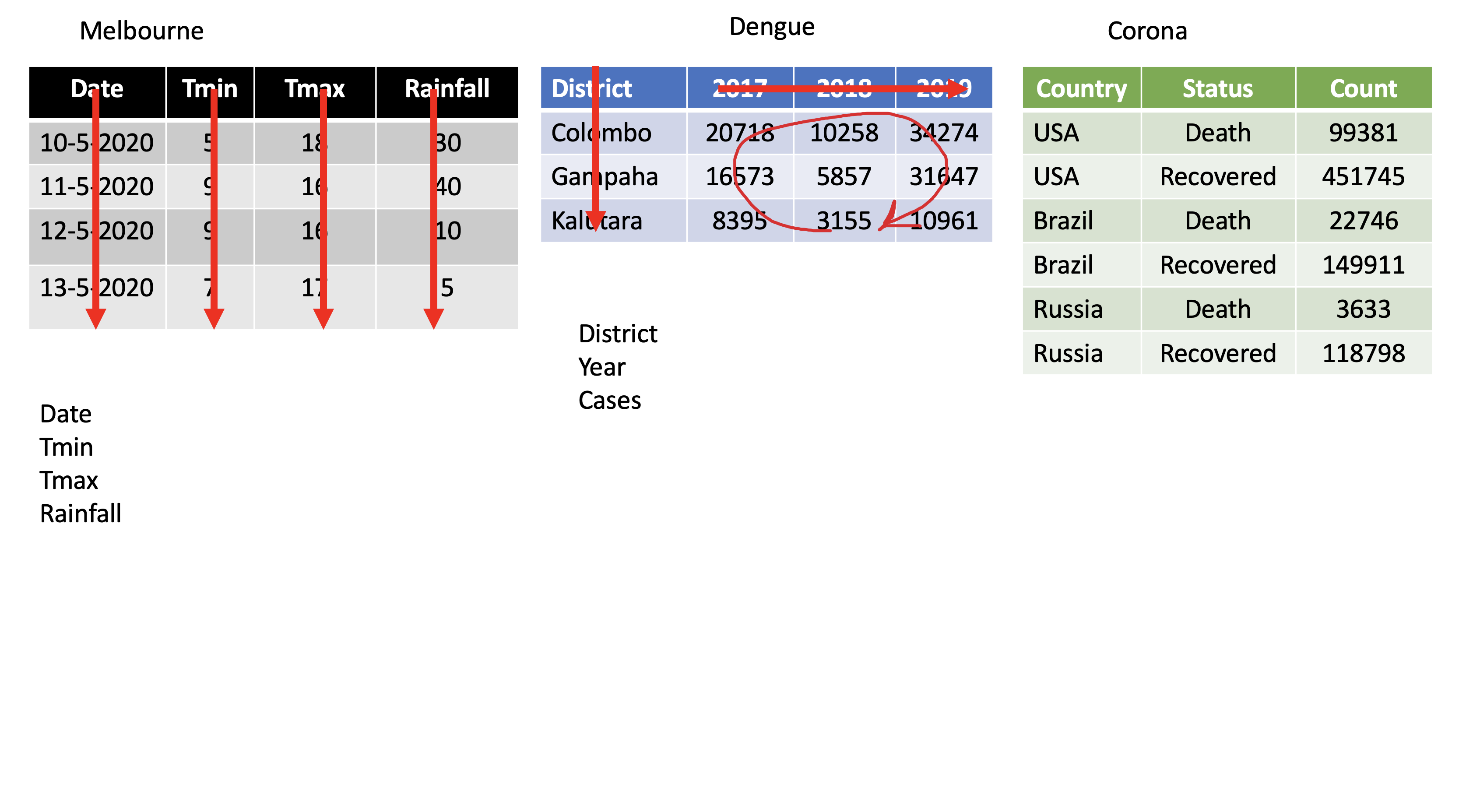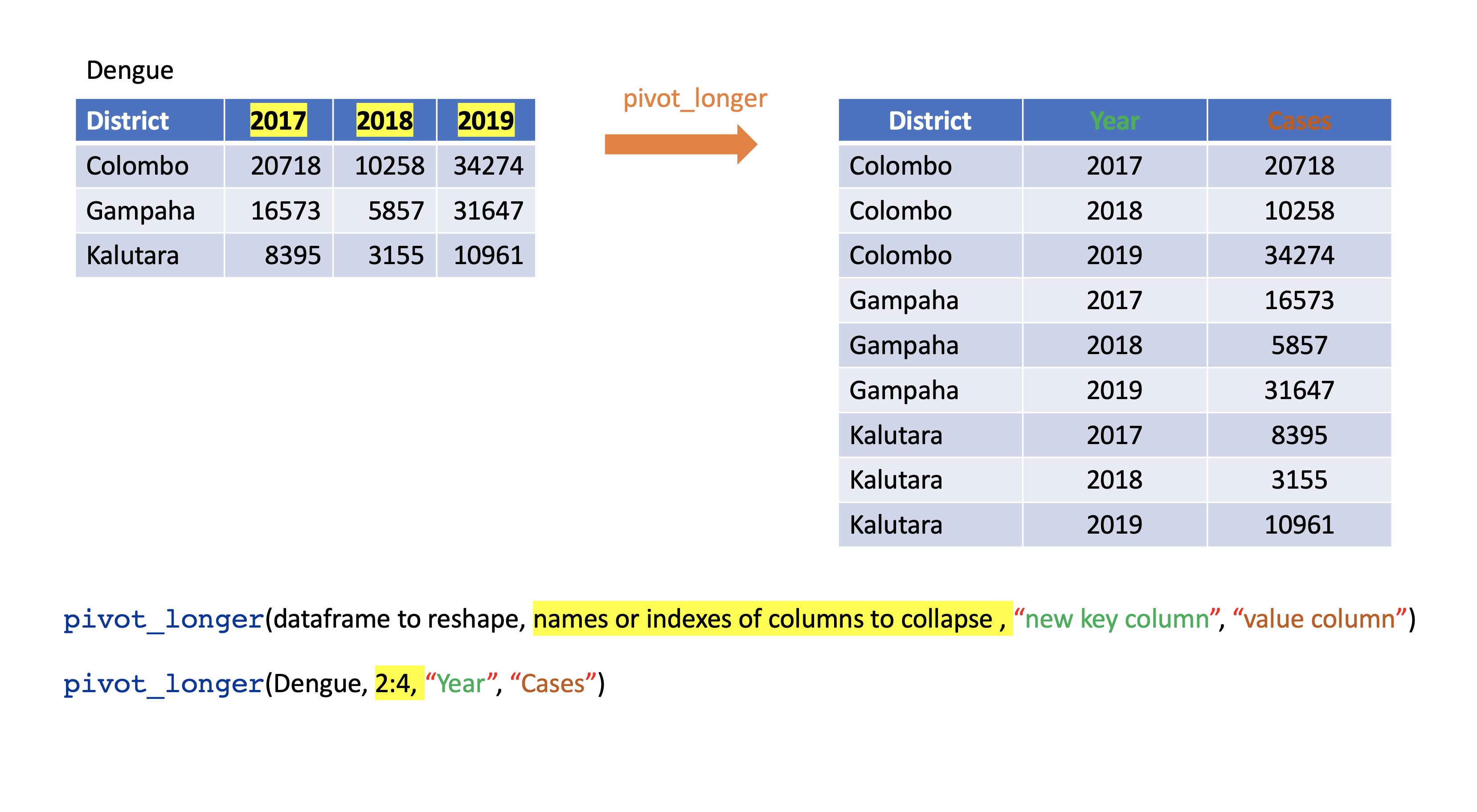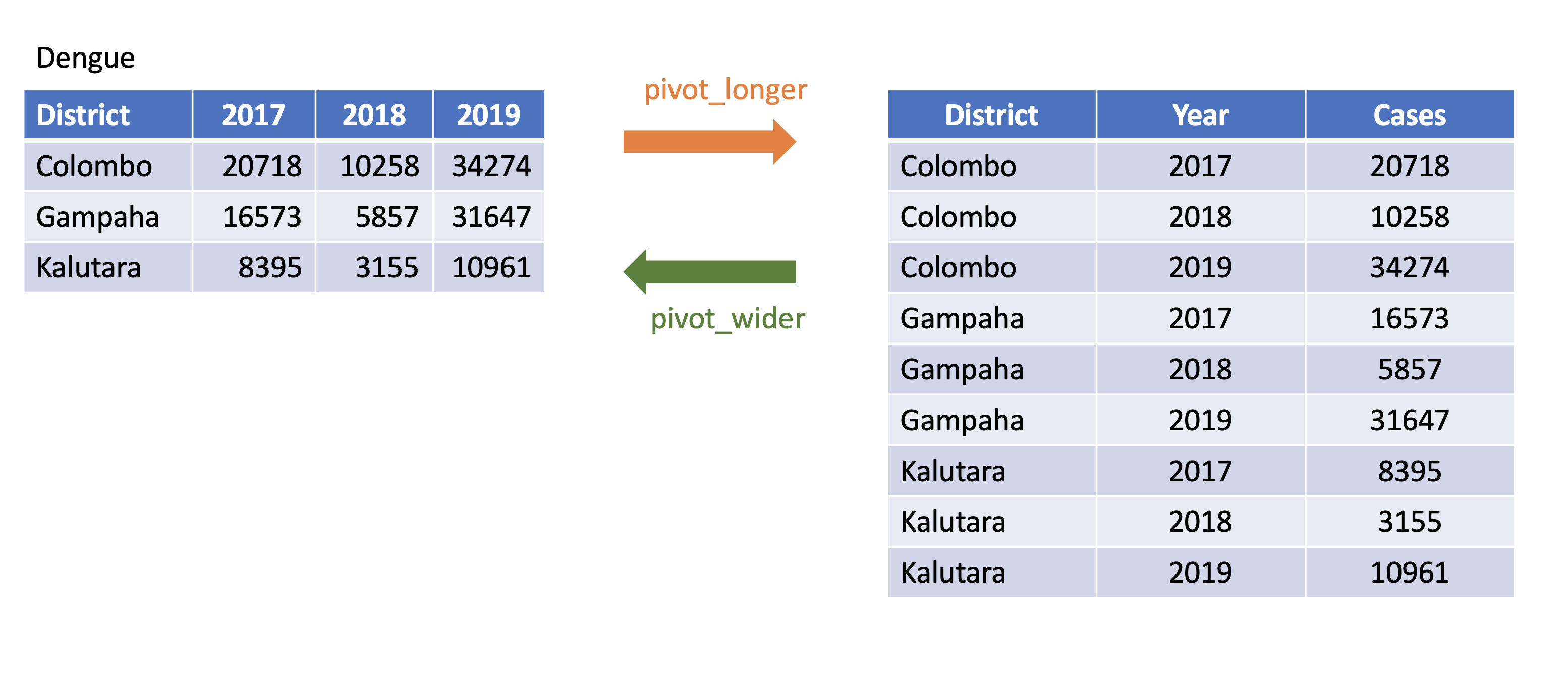 pivot_longer()dengue <- tibble( dist = c("Colombo", "Gampaha", "Kalutara"), '2017' = c(20718, 10258, 34274), '2018' = c(16573, 5857, 31647), '2019' = c(8395, 3155, 10961)); dengue