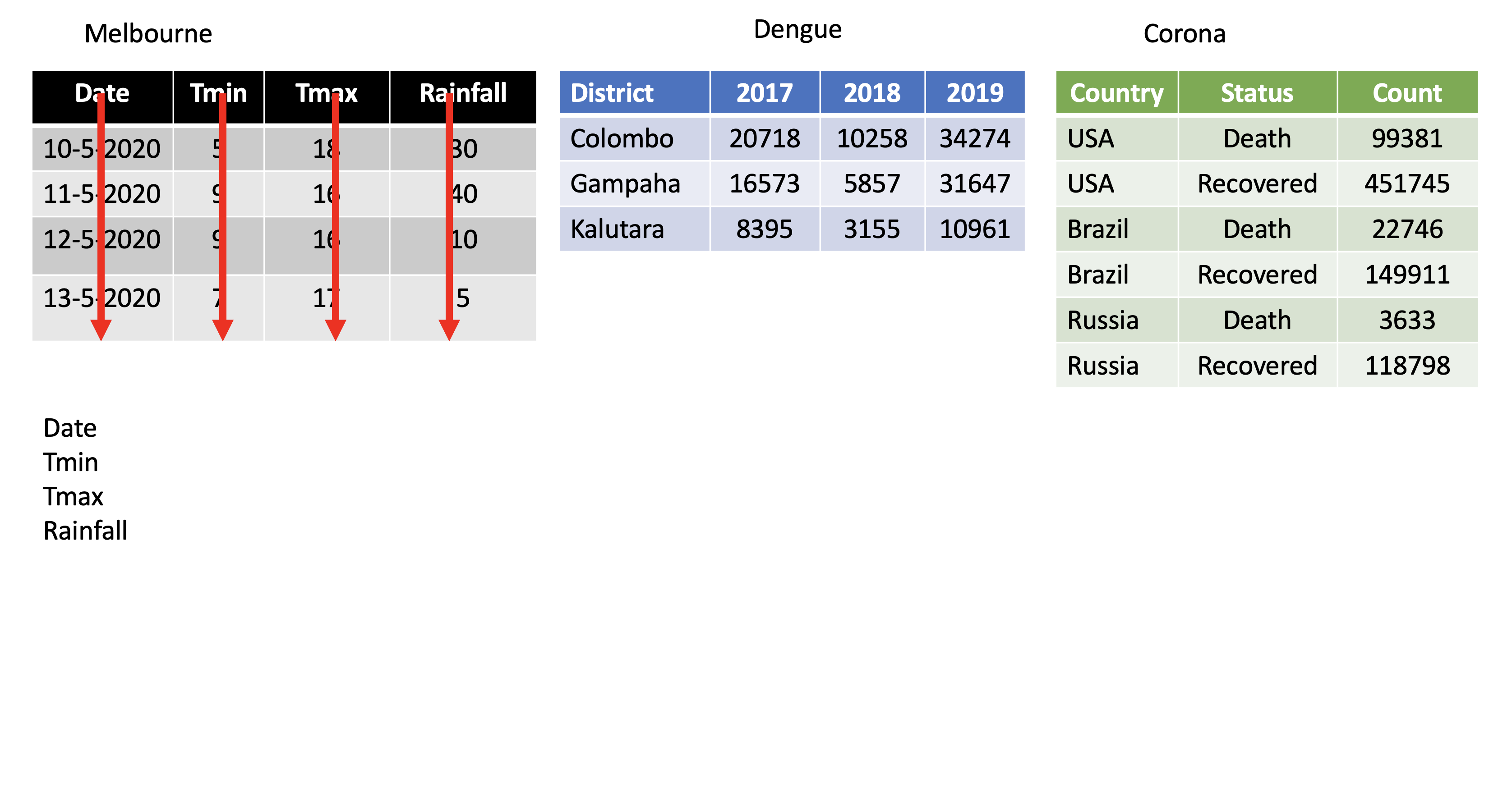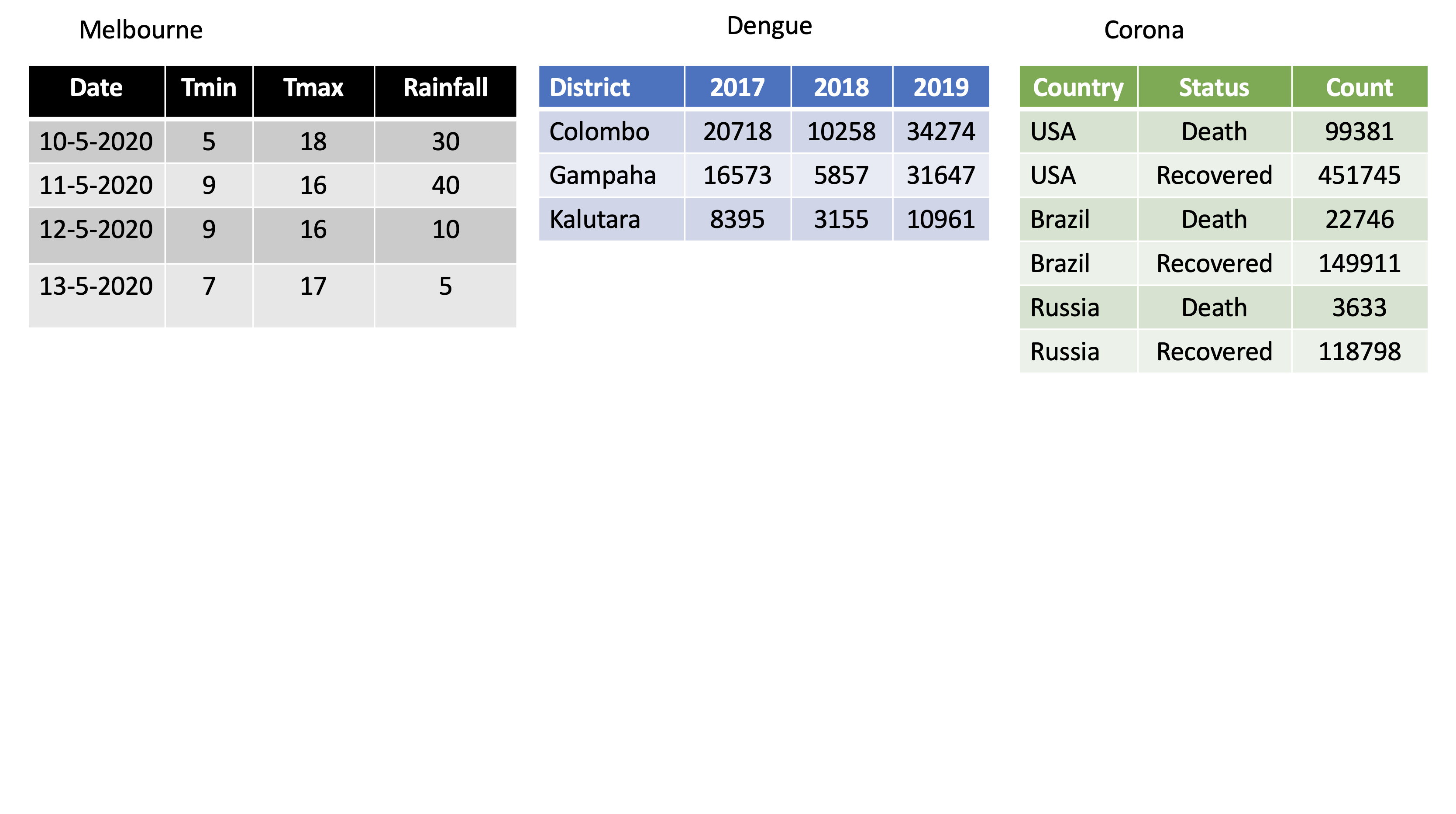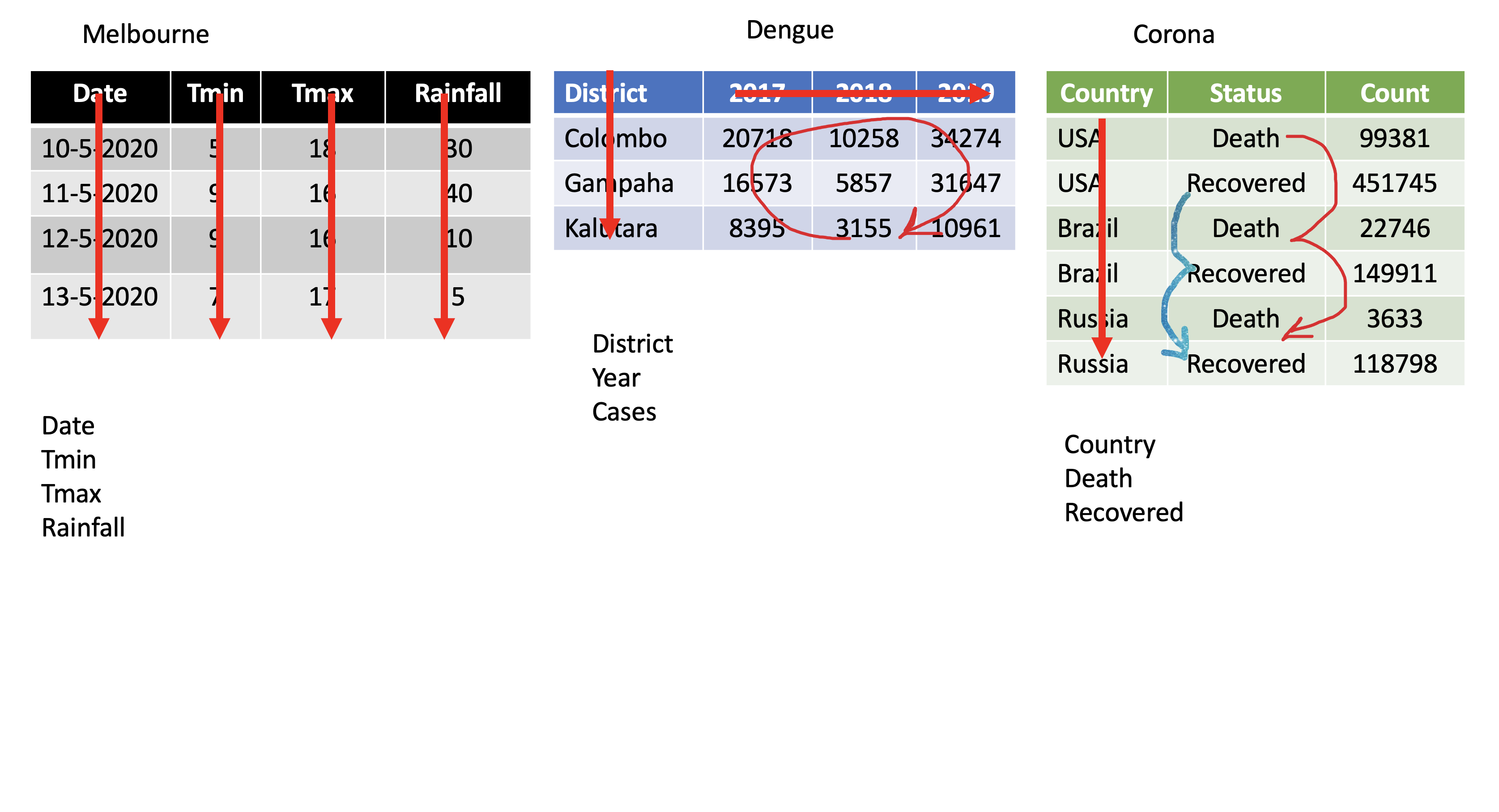 pivot_longer()dengue <- tibble( dist = c("Colombo", "Gampaha", "Kalutara"), '2017' = c(20718, 10258, 34274), '2018' = c(16573, 5857, 31647), '2019' = c(8395, 3155, 10961)); dengue