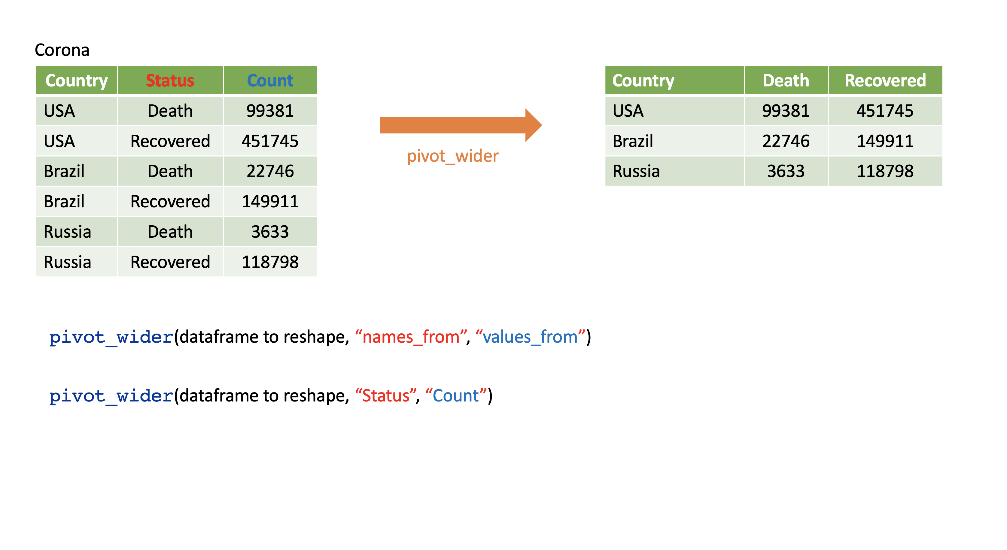 # A tibble: 3 x 3 country Death Recovered <chr> <dbl> <dbl>1 USA 99381 4517452 Brazil 22746 1499113 Russia 3633 118798corona_wide_format <- Corona %>% pivot_wider(names_from=status, values_from=count)corona_wide_format