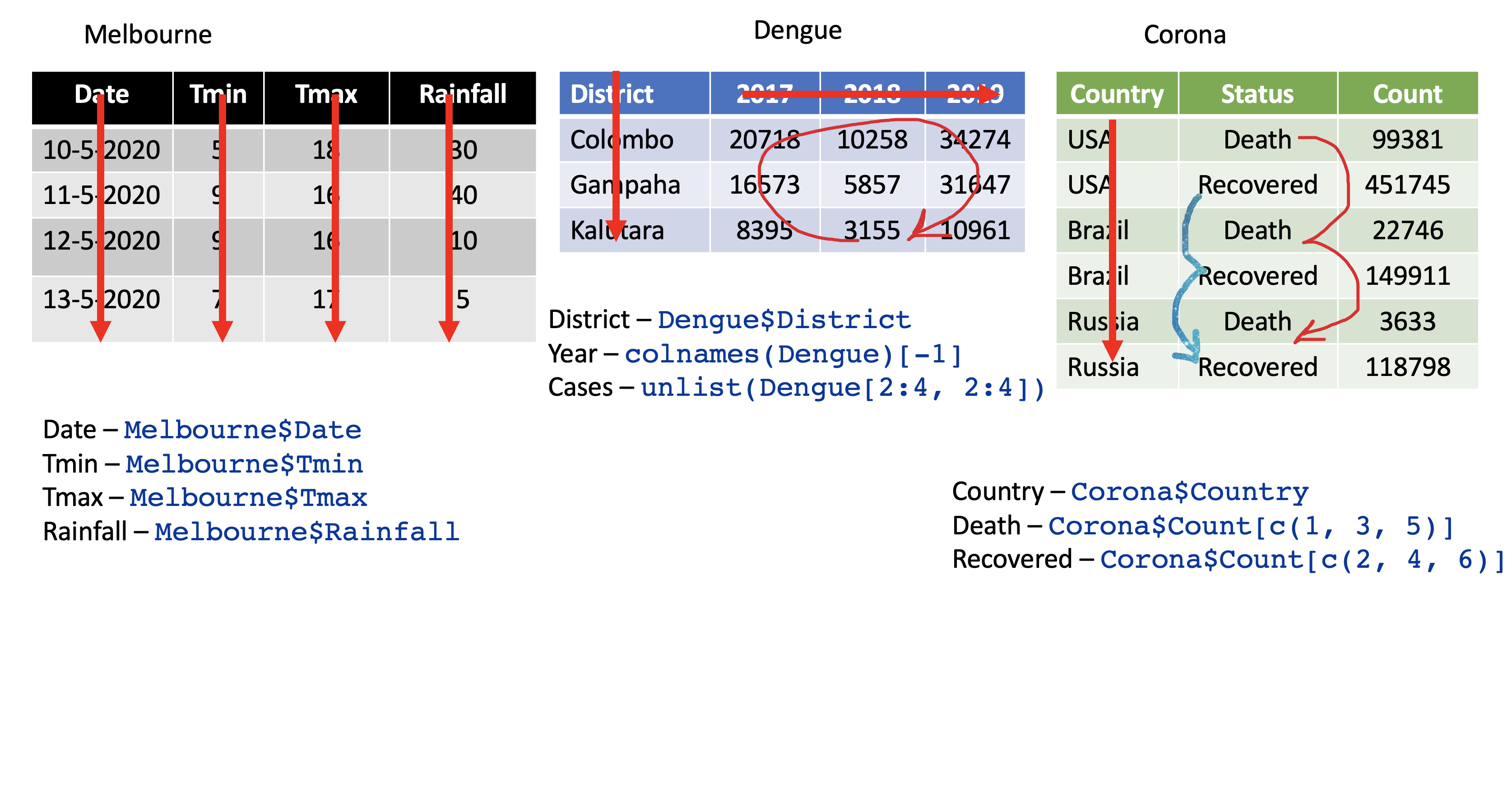 # A tibble: 3 x 3 country Death Recovered <chr> <dbl> <dbl>1 USA 99381 4517452 Brazil 22746 1499113 Russia 3633 118798pivot_longer vs pivot_wider